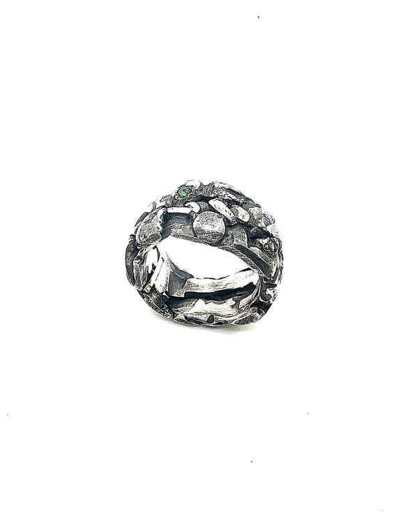 Subtle green CZ stones glimmer from within the raw texture, adding a touch of mystery.