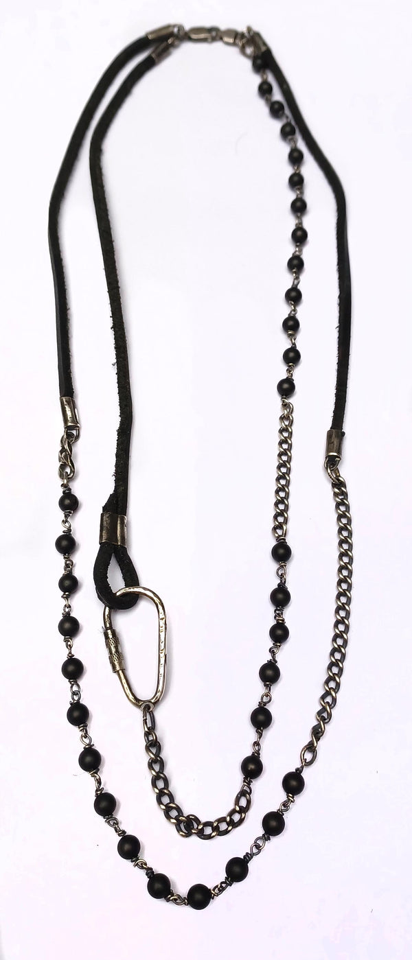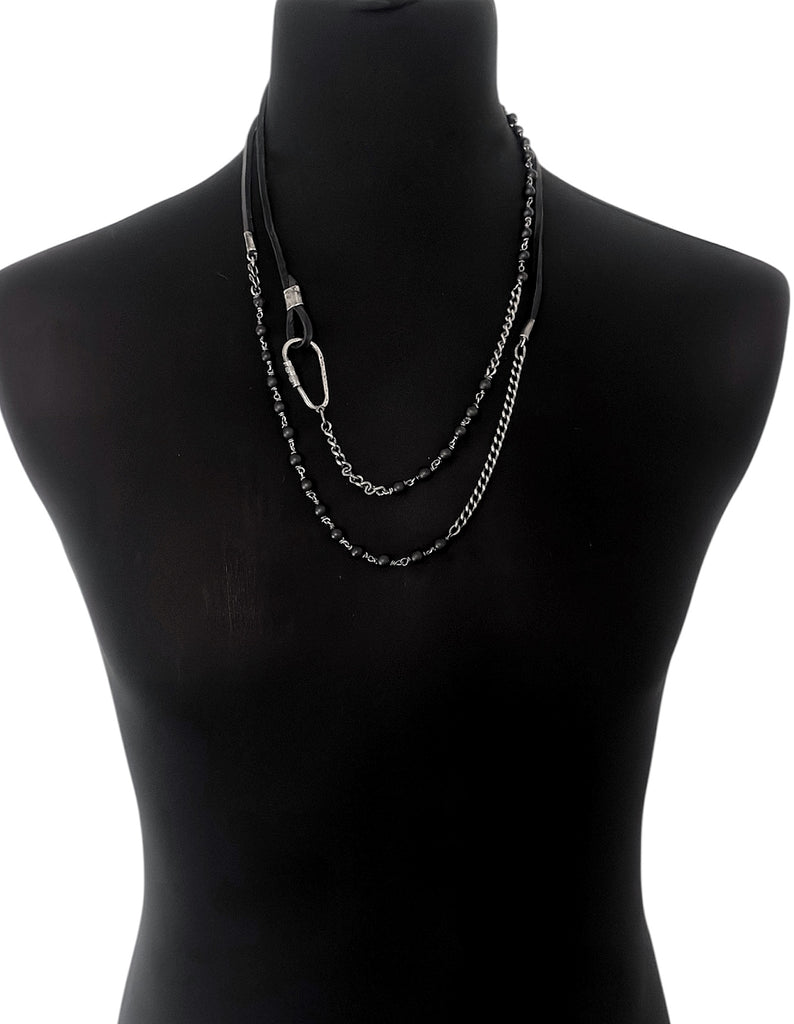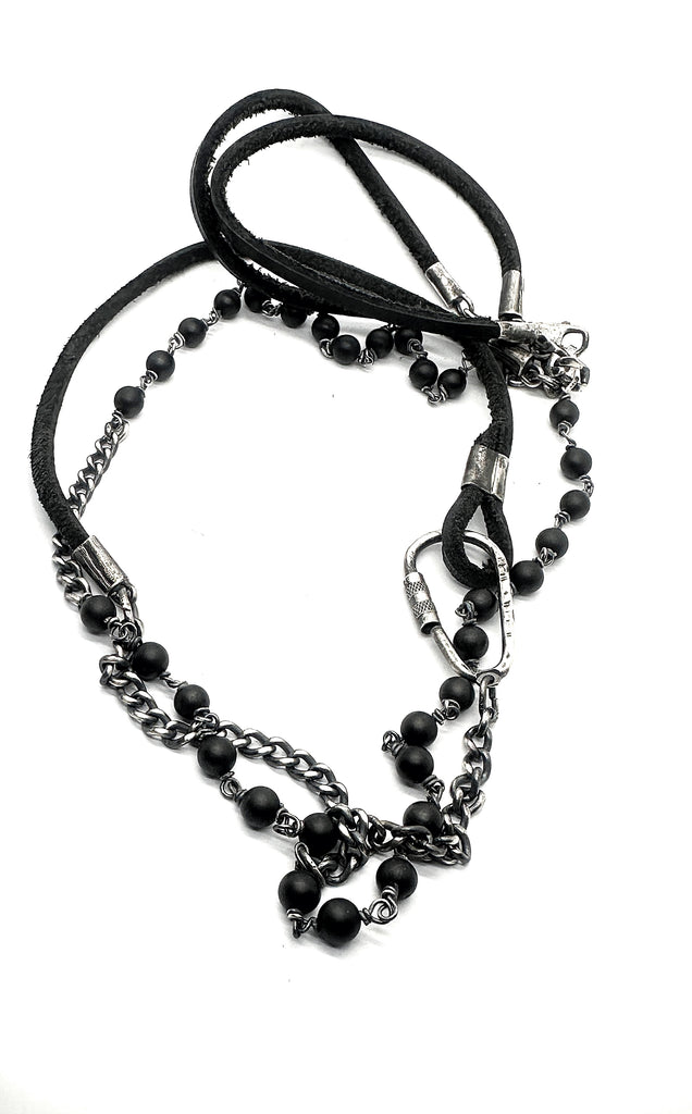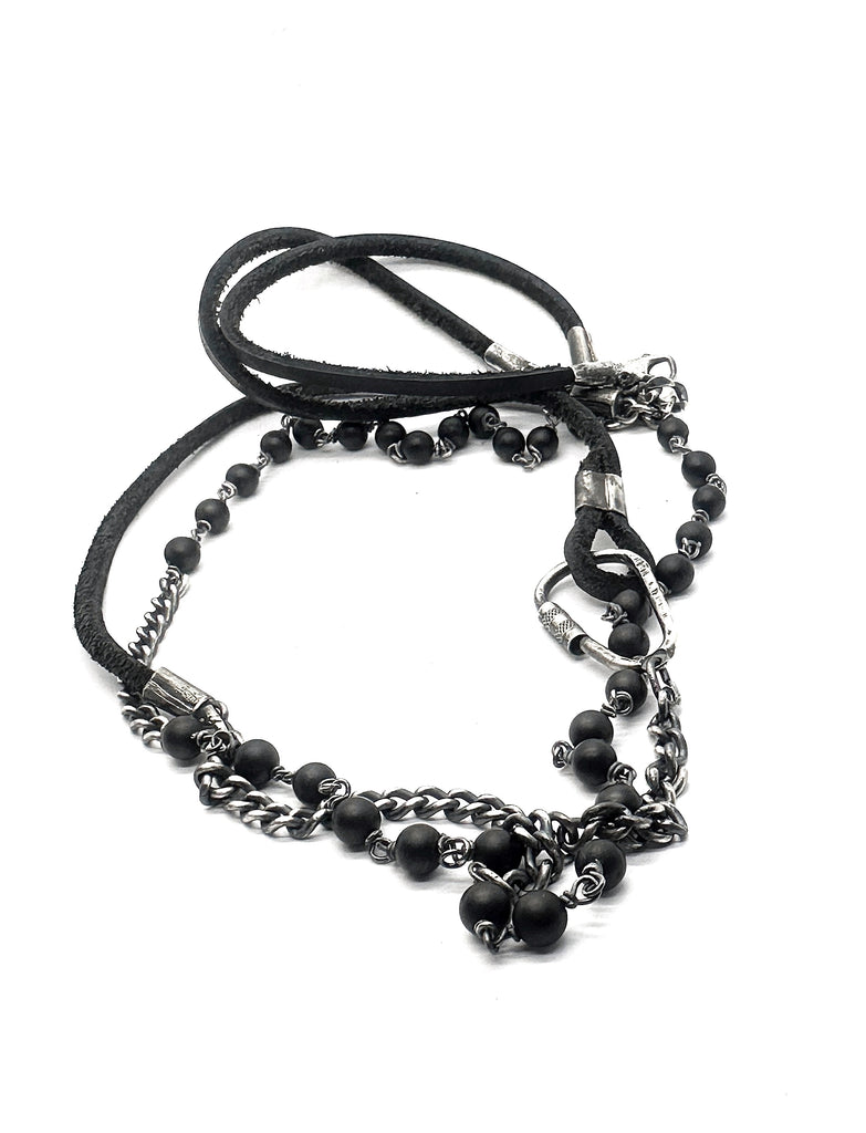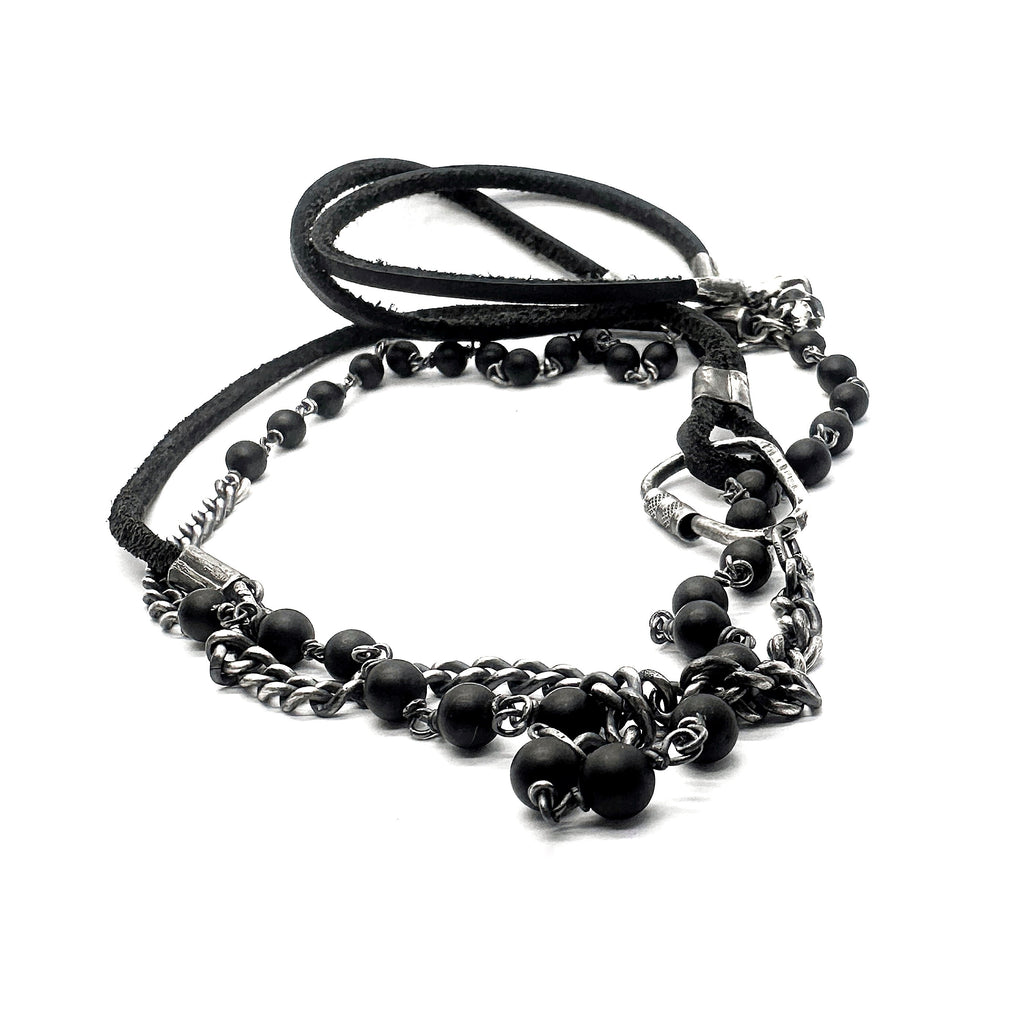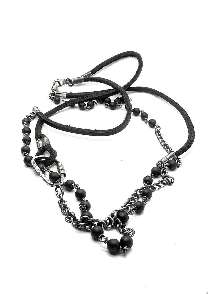 The Talos necklace is an ode to ancient strength and modern edge. Hand-finished oxidised silver links interlock with rugged black leather, creating a piece that feels as powerful as the mythological guardian itself. Embrace its raw, protective energy and let this statement adornment tell your story of resilience and untamed elegance.