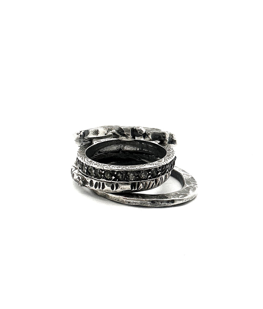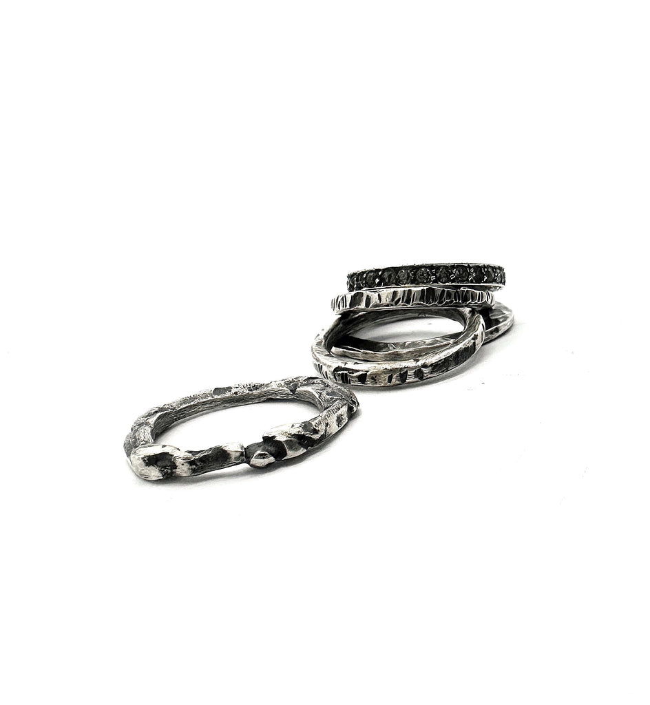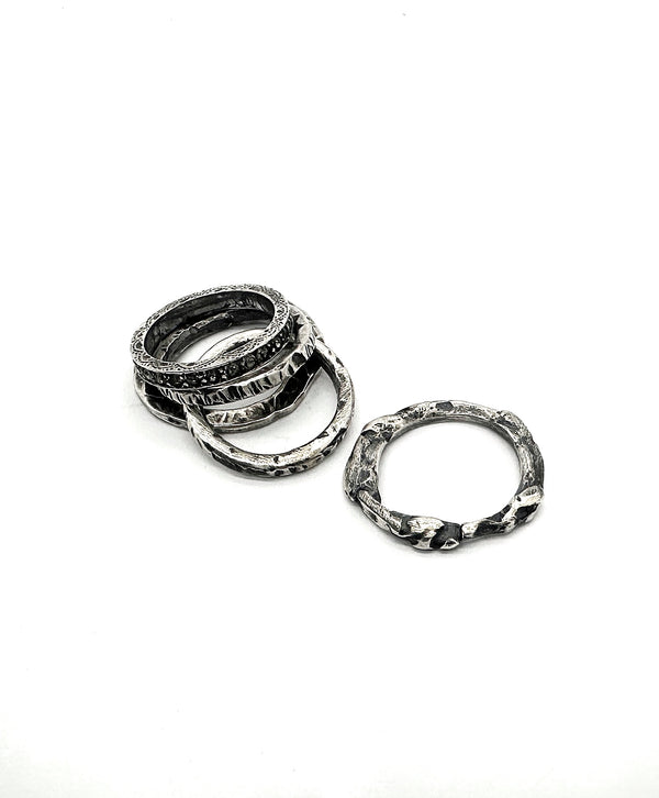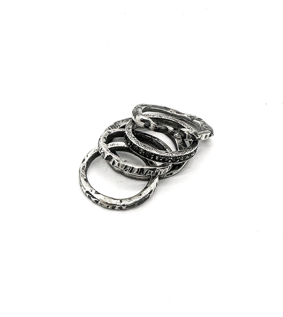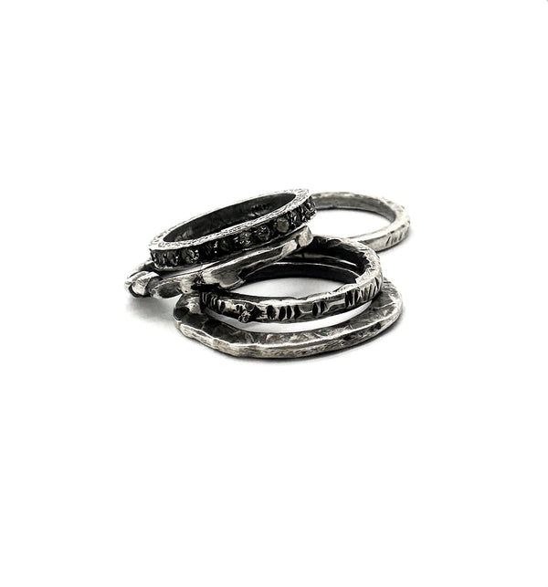 A set of five bold and distressed stack silver rings, designed to be worn together or apart.