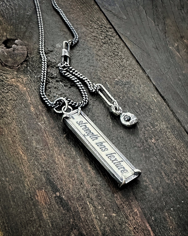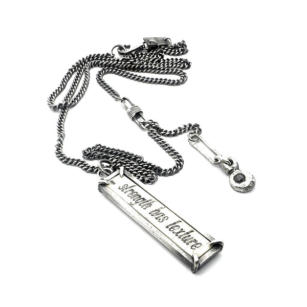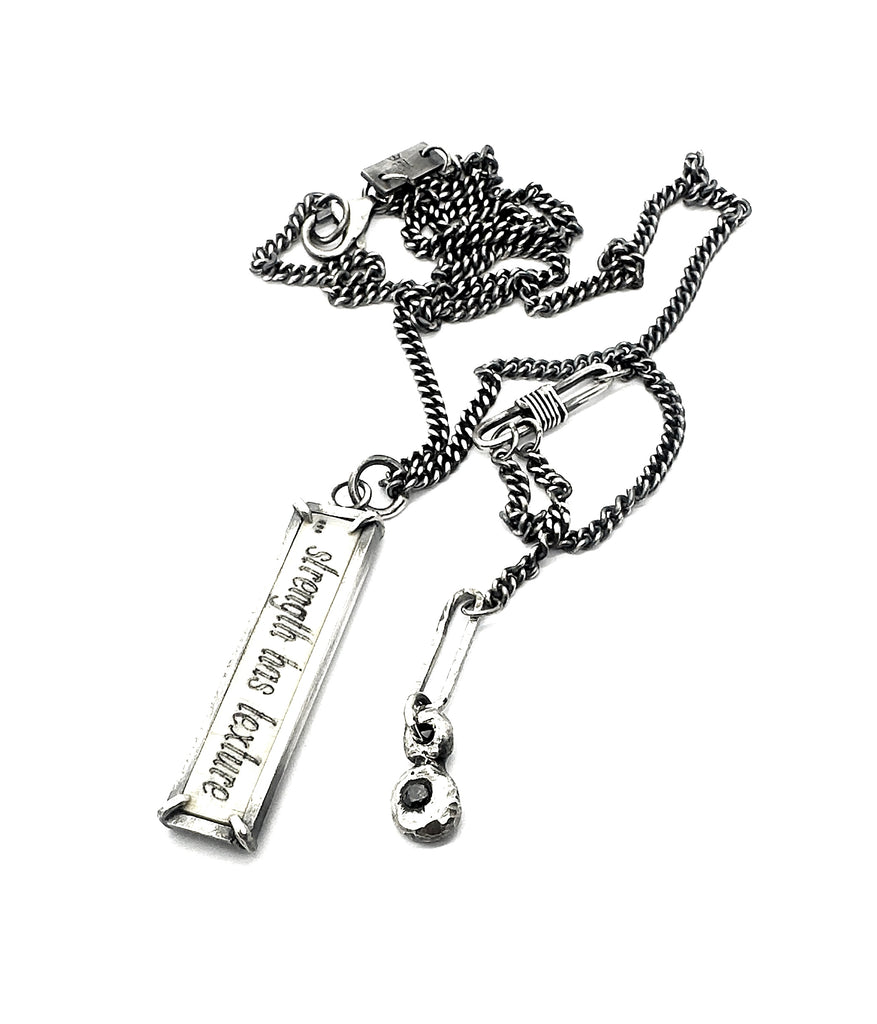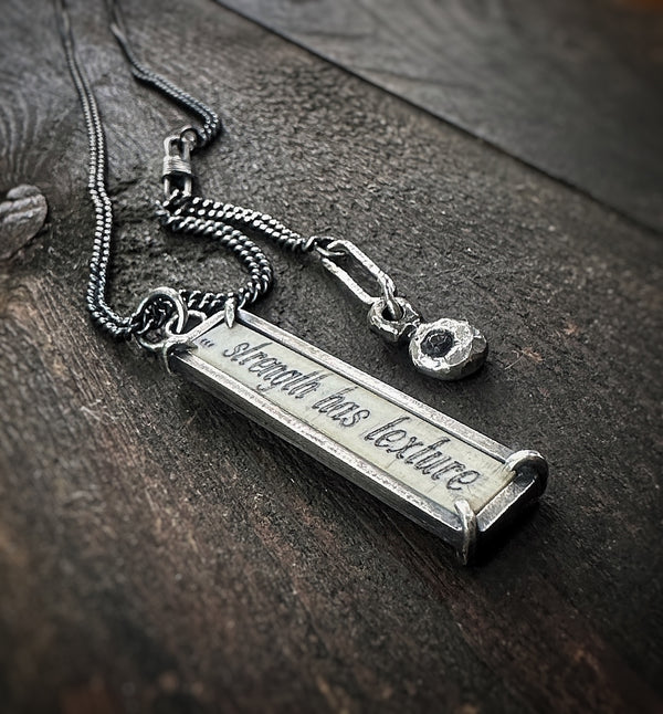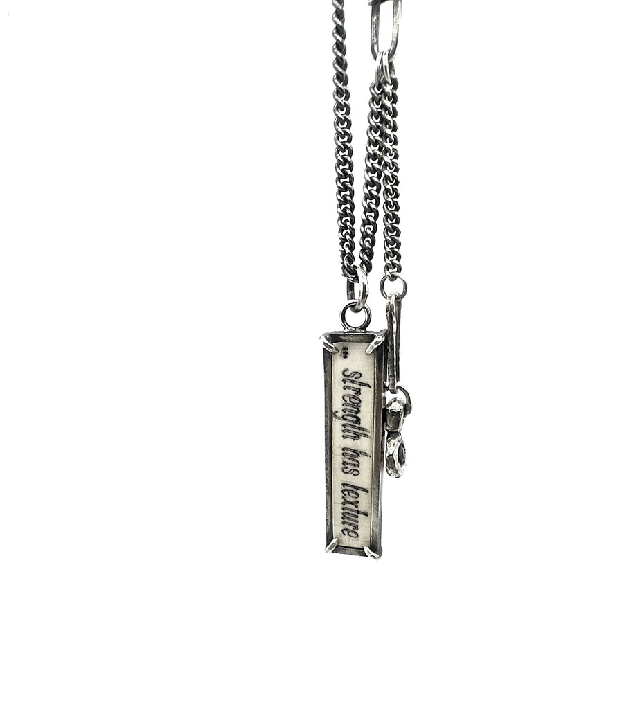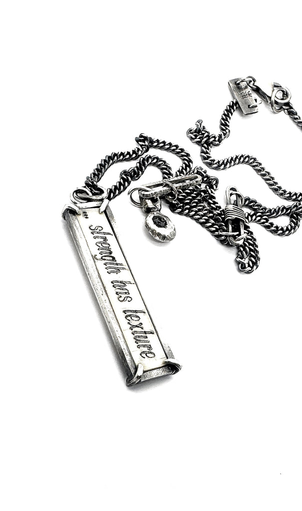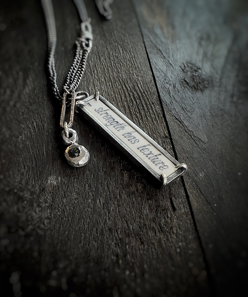 The engraving “Strength has texture” speaks to the beauty found in endurance, in every scar and contour life leaves behind. An avant-garde relic for those who understand that strength is never smooth, a reflection of resilience, not refinement.