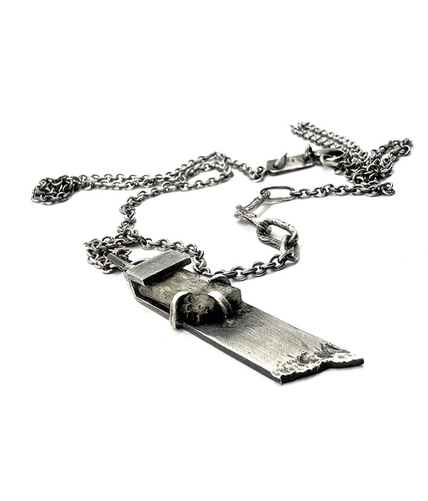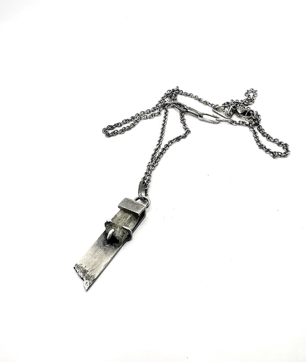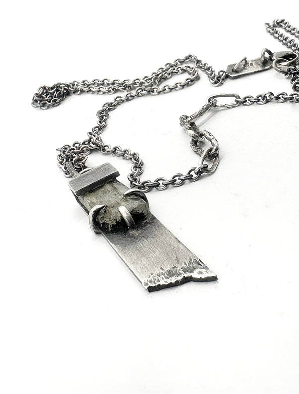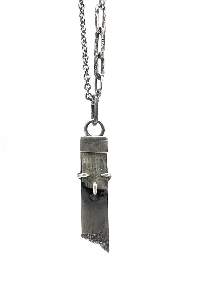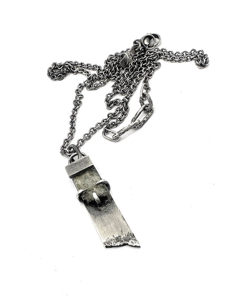 Forged in oxidised silver, this necklace carries the weight of imperfection with unapologetic grace. A distressed tag pendant bears the scars of process and time, framing a raw yellow tourmaline like a captured spark.