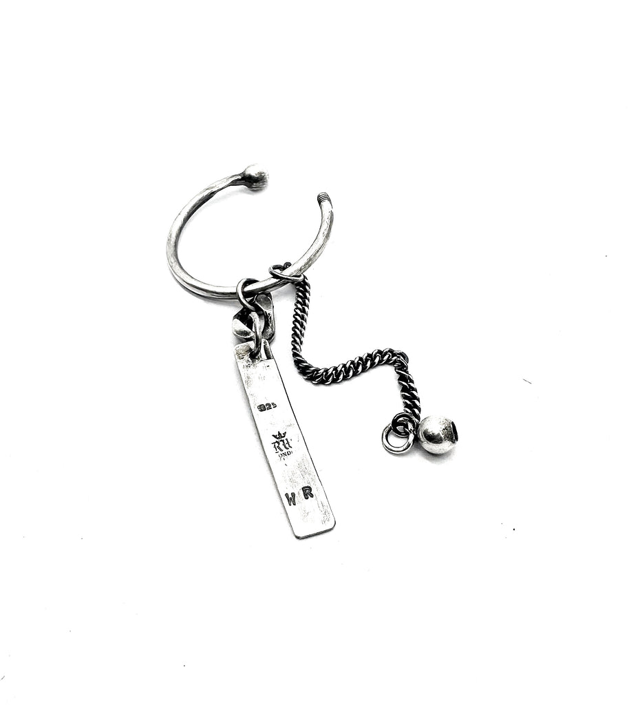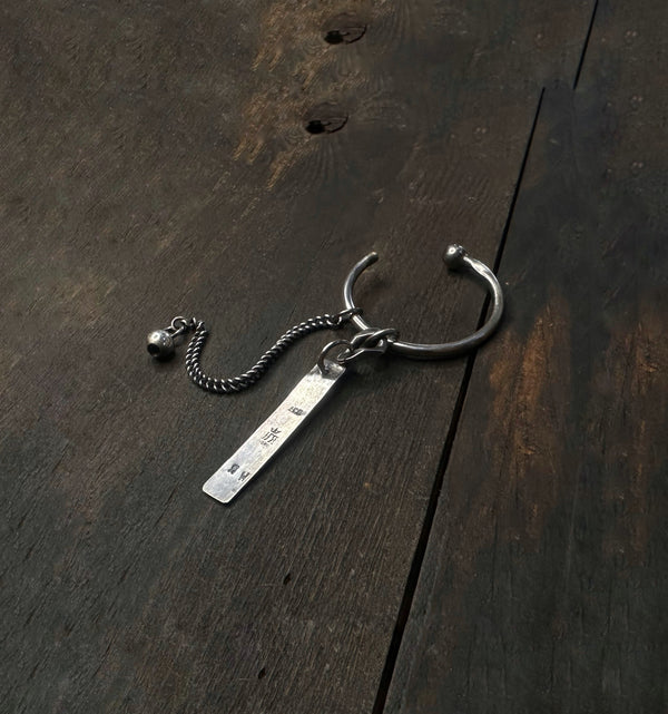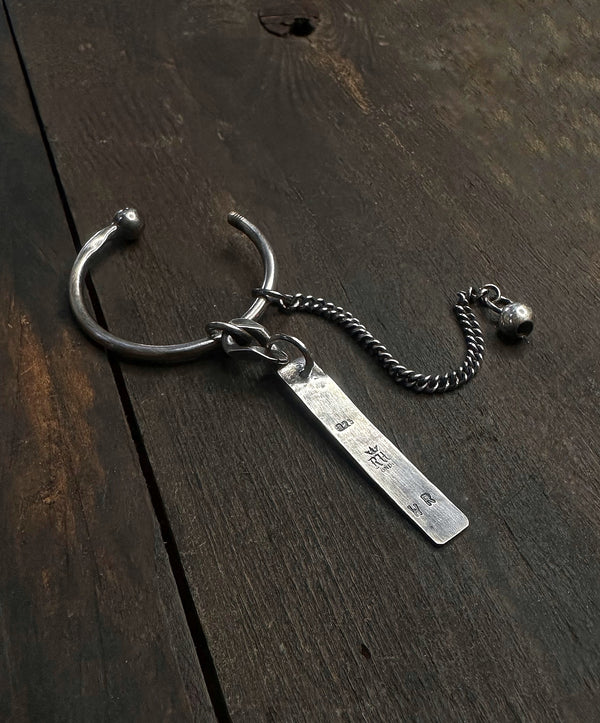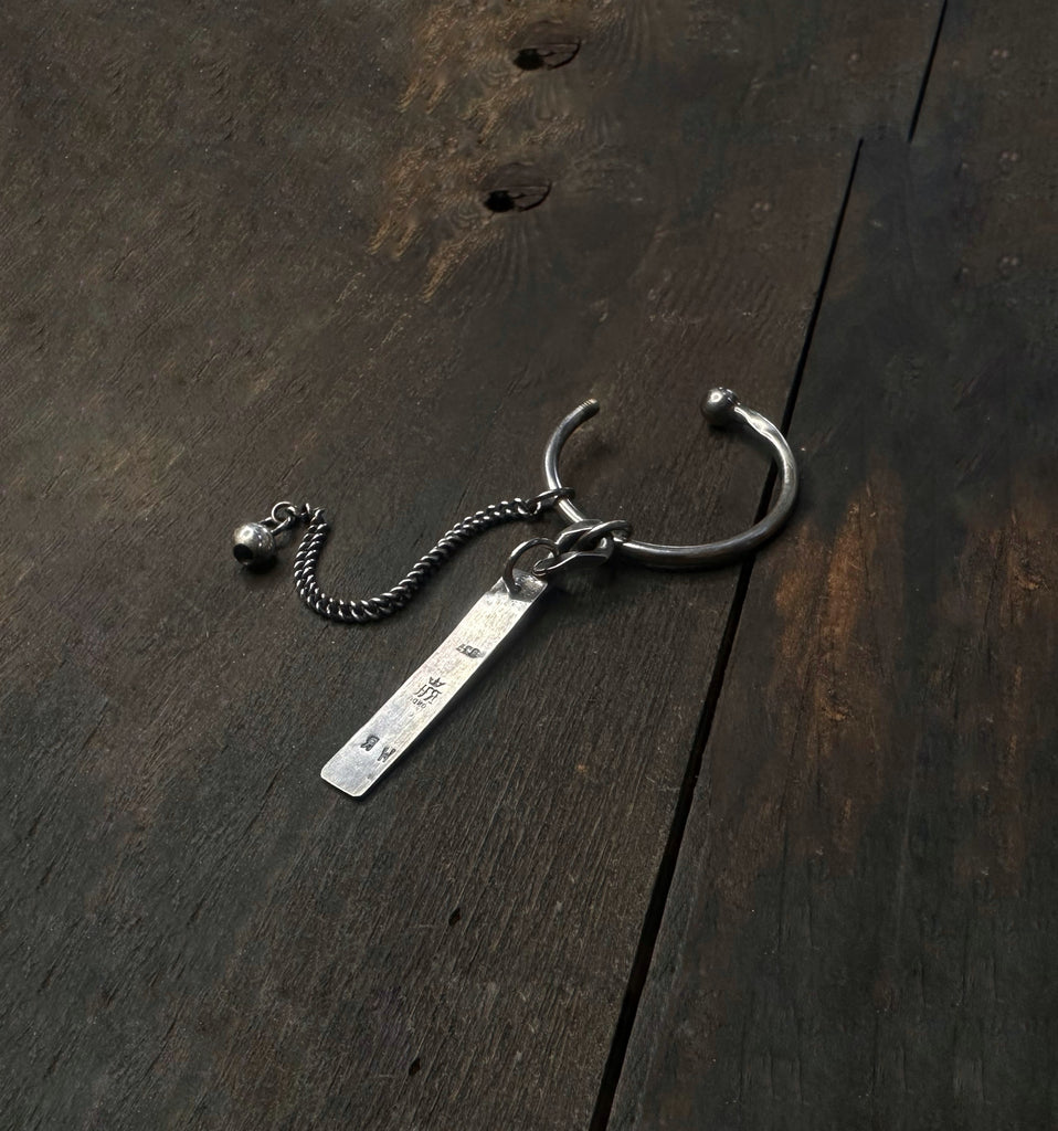 A hand-forged ring holds a rectangular silver tag stamped with artisanal markings.