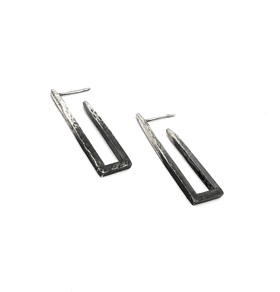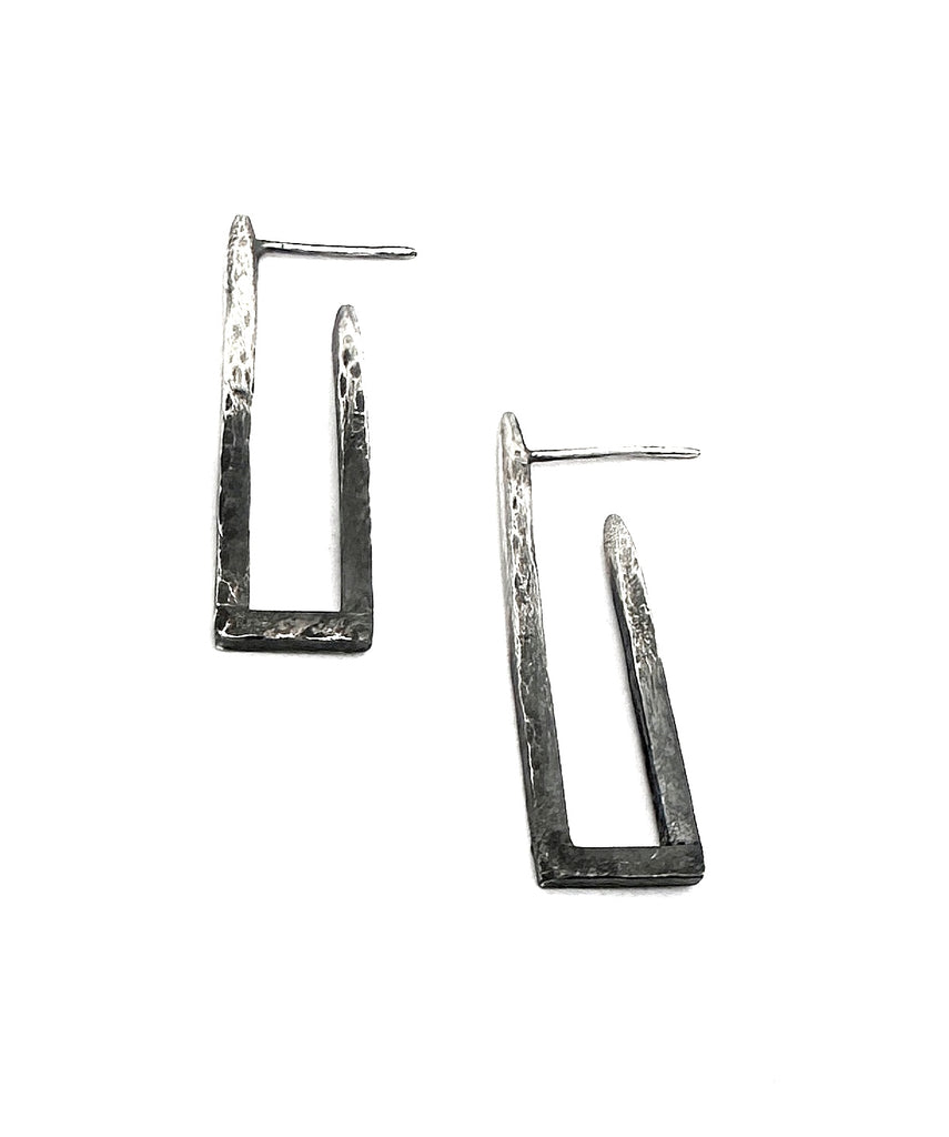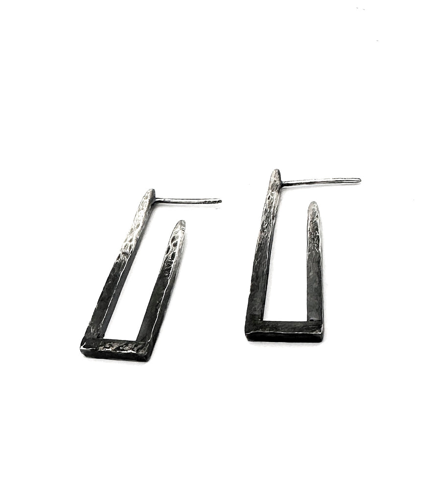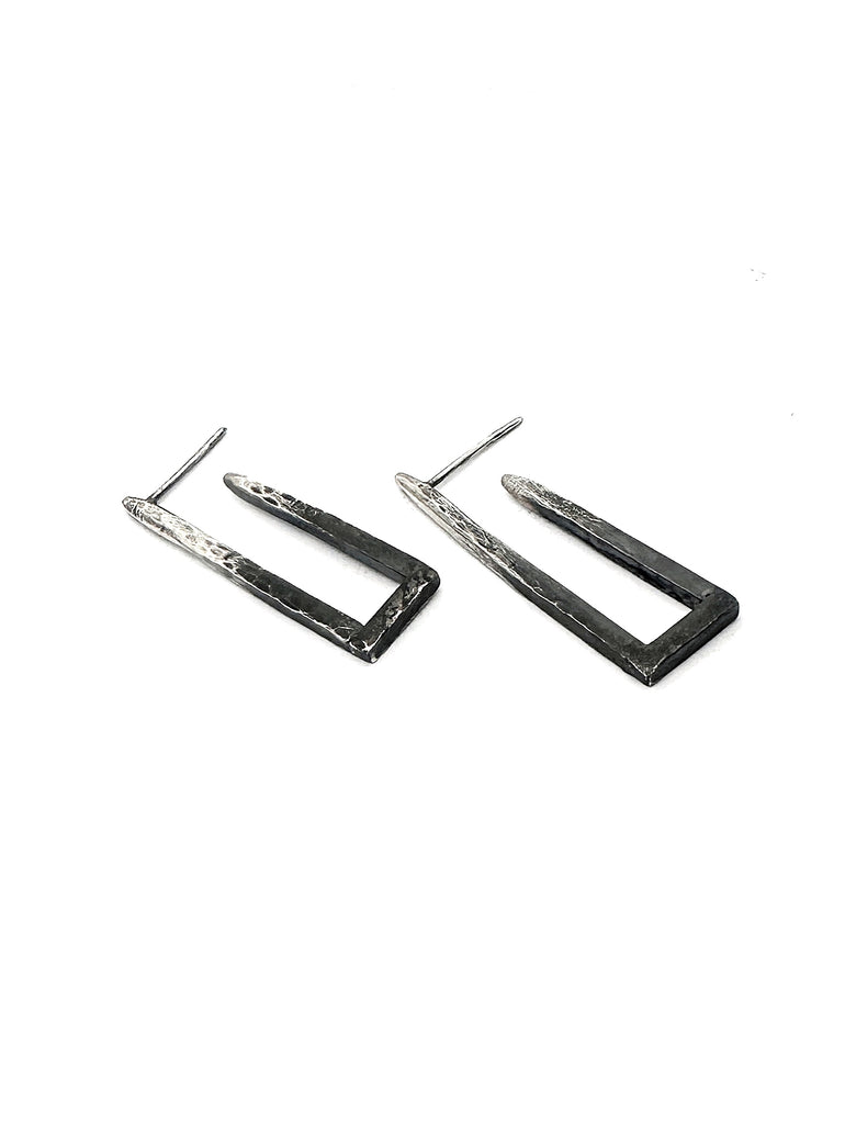 Sharp and deliberate, these silver earrings carve space with quiet intensity. Their distressed, hammered surface captures light like worn steel in shadow, geometric lines meet raw texture for a striking modern edge. Minimal yet powerful, they embody restraint, strength, and emotion. Designed for those who wear darkness with intention.